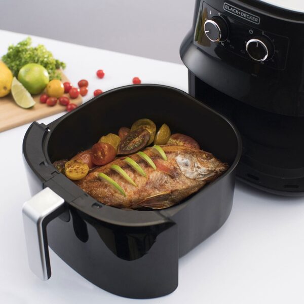 Cocina sin culpa y más rápido con La Freidora de Aire Saludable de BLACK+DECKER®. Con capacidad de 4.5 litros, es perfecta para freír y hornear porciones más grandes de tus comidas favoritas en poco tiempo. Con esta revolucionaria manera de cocinar, puedes disfrutar deliciosos alimentos fritos sin grasa y con el mismo sabor.