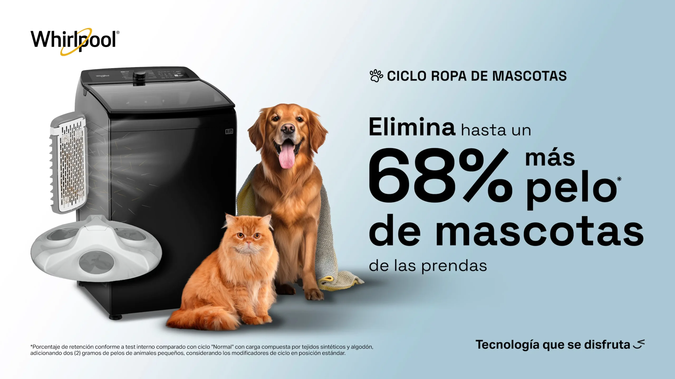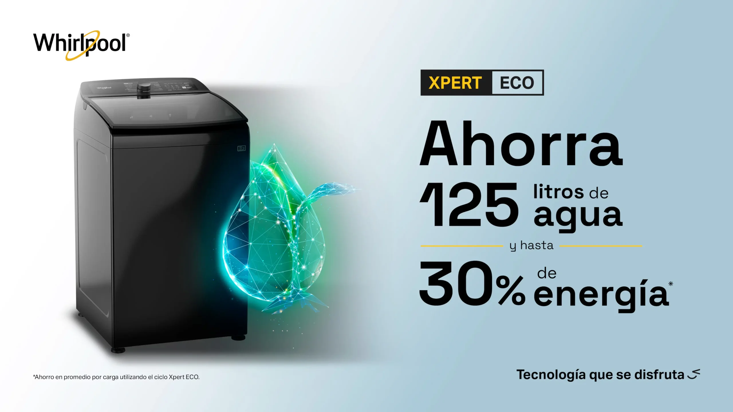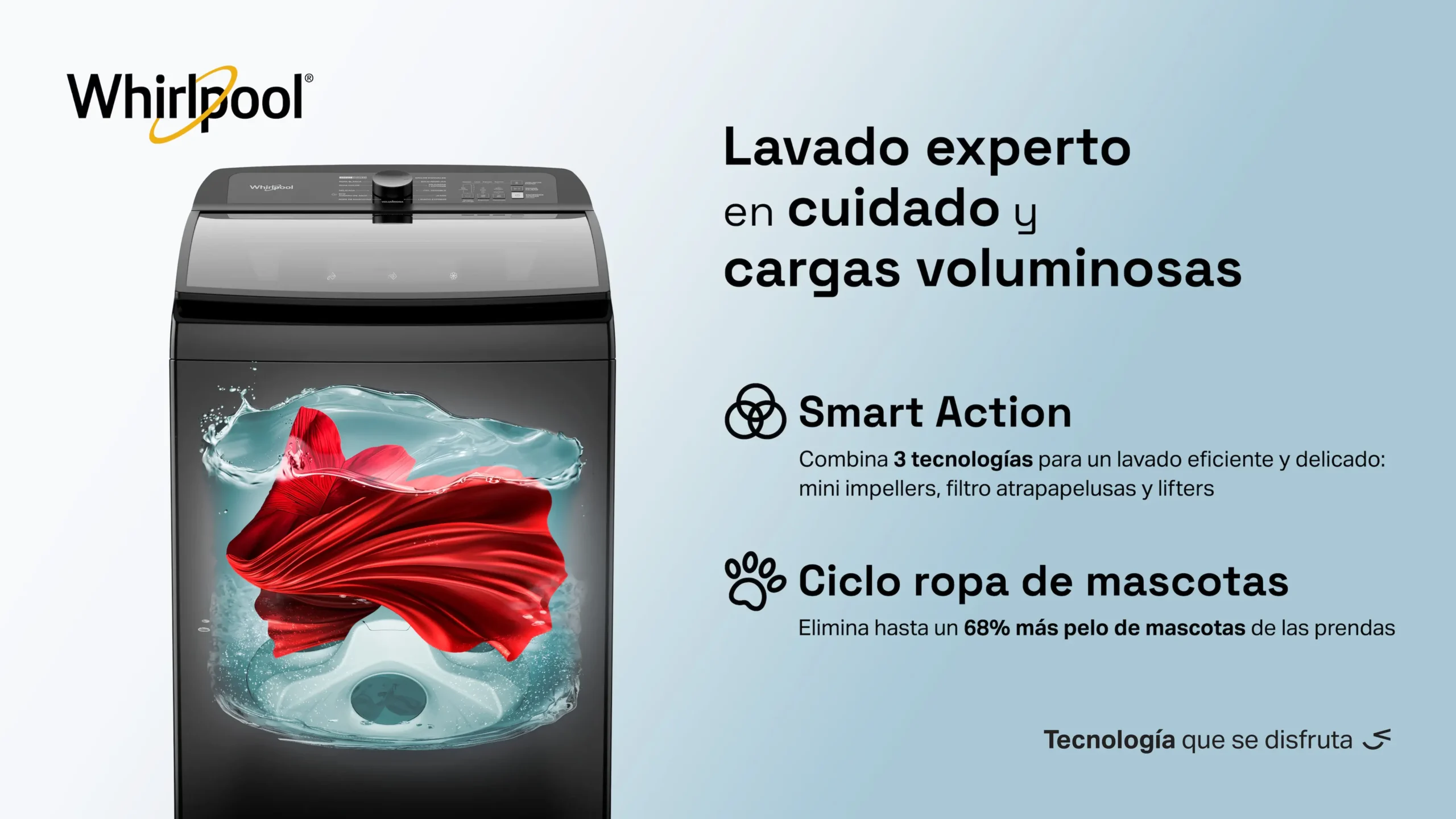 La Lavadora Whirlpool WW19NTBHLA de 19 kg en elegante color Gris Tempest ofrece un lavado inteligente, potente y eficiente. Con su exclusivo Sistema Xpert Eco, ahorra hasta 125 litros de agua y un 30% de energía en cada carga, garantizando un menor impacto ambiental y mayor cuidado de tus prendas. Su tecnología Smart Action combina tres movimientos de lavado para eliminar la suciedad más difícil sin dañar la ropa. Además, incluye ciclos especializados como el de Ropa de Mascotas, que elimina hasta un 68% más de pelos. Gracias a su Impeller de alta eficiencia, múltiples ciclos Xpert y depósitos automáticos, esta lavadora Whirlpool es la opción perfecta para quienes buscan ahorro, rendimiento y cuidado avanzado.